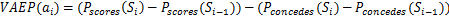 也就是说,在该动作前的比赛状态为Si-1,进球机会的值为Pscores(Si-1),丢球机会值为Pconcedes(Si-1),经过了动作ai,比赛状态变为Si,进球机会的值变为Pscores(Si),丢球机会值为Pconcedes(Si)。那么一个动作对比赛结果产生的影响VAEP(ai)的公式为: