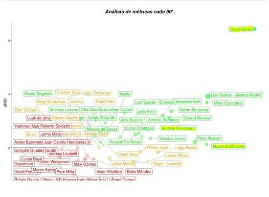 巴萨让进球机会溜走这一点,在巴萨的锋线球员身上得到了最好的体现,梅西的情况尤为突出。考虑球员的预期进球数——这是一项高级的足球指标,显示的是球员在射门时的表现,也基于不同的变量(如射门位置、距离、接到的传球类型等)来解释射门的质量。
