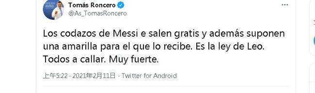 在社交网站上,托马斯·隆塞罗对此表示了不满:“梅西的肘击不被处罚,而被他侵犯的人反而吃到了黄牌。这就是莱奥法则。大家都闭嘴吧。”(塞尔吉奥)