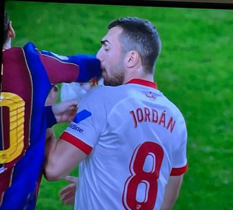 那是比赛的第62分钟,塞维利亚1比0领先,主裁判拉奥斯判罚霍尔丹对梅西犯规,塞维利亚方面表示了抗议。当时霍尔丹拿住了皮球,不让巴萨方面快速开球,梅西对此十分不满,多个角度的画面都显示,梅西从身后去抢皮球时,扬起的手臂打到了对方的脸。