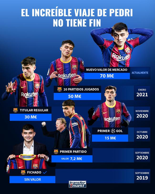 佩德里的升值速度之快令人惊叹。2019年9月刚被巴萨签下时,他还没有身价。在代表巴萨首秀的时候,他的身价只有720万欧元。去年10月升值到1500万欧元,11月升值到3000万欧元,1月份升值到5000万欧元,3月份升值到7000万欧元。