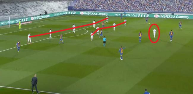 如图所示,当皇马处于无球阶段时,巴尔韦德会来到巴斯克斯外侧,形成实质上的五后卫站位,充分覆盖防守宽度。