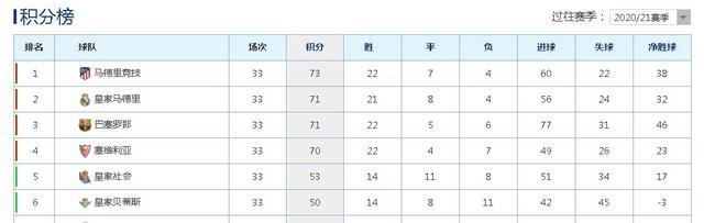 在西甲积分榜上,现在所有球队比赛场次都一样了,那就是踢了33轮。目前马竞以73分排名第一,巴萨和皇马都积71分,但皇马凭借相互战绩排名第二,塞维利亚则是积70分排名第四。