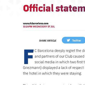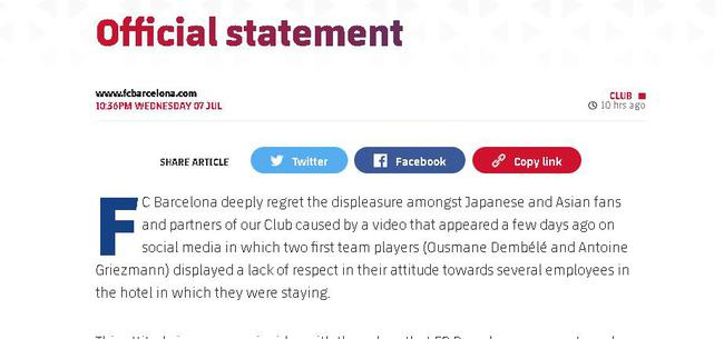 巴萨官方表示,几天前在社交媒体上出现的一段视频,引发了日本以及亚洲球迷,还有巴萨的合作伙伴的不满,巴萨对此深表遗憾。视频中两名一线队球员(登贝莱和格列兹曼)对酒店的员工表现出缺乏尊重的态度。这种态度与巴塞罗那足球俱乐部所代表和捍卫的价值观完全不符。