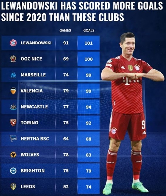 而更为夸张的比较,则是莱万从2020年开始计算的进球数,竟然高达101粒,这其实比一些五大联赛球队的进球数还要多。