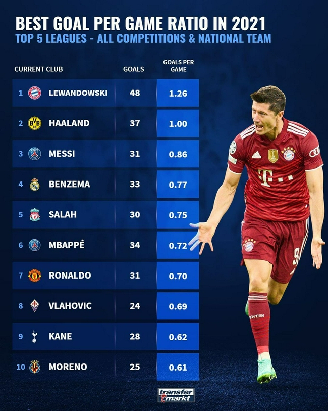 根据德国转会市场网站的统计,在五大联赛,今年莱万多夫斯基的场均进球率相当惊人,达到了场均1.26粒,远远高出排名第二的哈兰德,至于曾经也能够超过场均1球的梅西和C罗,进球率已经出现了明显的下滑。