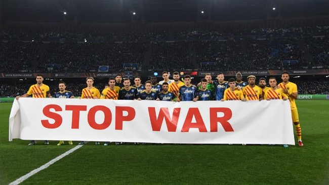 最近俄罗斯和乌克兰发生冲突,球员对此也十分关注。在巴萨和那不勒斯的比赛之前,两队球员决定联合展示一条反对战争的横幅,横幅上写的是“停止战争”。