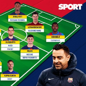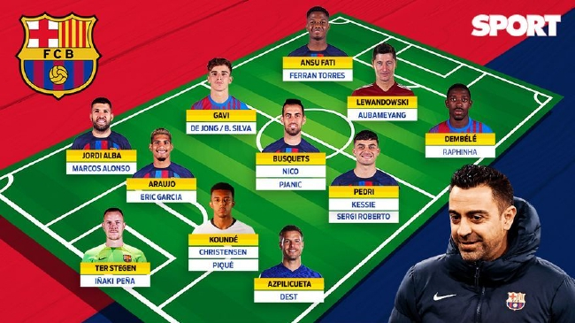 特尔施特根(佩尼亚)/阿尔巴(阿隆索)、阿劳霍(埃里克·加西亚)、孔德(克里斯滕森、皮克)、阿兹皮利奎塔(德斯特)/加维(德容、B席)、布斯克茨(尼科、皮亚尼奇)、佩德里(凯西、罗伯托)/法蒂(费兰·托雷斯)、莱万(奥巴梅杨)、登贝莱(拉菲尼亚)