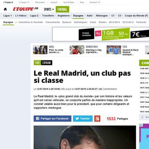 “皇马,一家没品的俱乐部”,《队报》的标题这样写道,文章还称,足球历史上最强大的俱乐部,却经常以一种不妥当的方式行事。