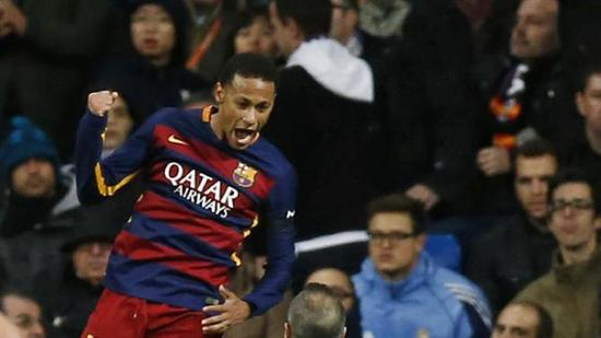 巴萨第39分钟扩大比分!伊涅斯塔左肋直塞,越位的苏亚雷斯没有触球,内马尔小禁区角上左脚推射从纳瓦斯身下入网,2比0,梅西起身高举双拳庆祝,这是内马尔6场国家德比第3球,个人联赛进球达到150个(桑托斯179场联赛107球;巴萨70场联赛43球),俱乐部和国家队进球则达到250个(401场)。巴萨连续19个西甲进球由苏亚雷斯(9球)和内马尔(10球)包办,两人连续4场正式比赛都有进球。