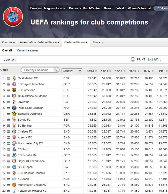 欧足联官方定义的球队欧战系数,取决于该俱乐部在欧冠以及欧联杯取得的系数得分,一共统计该俱乐部在过去五个赛季的欧战系数得分(包含本赛季)。