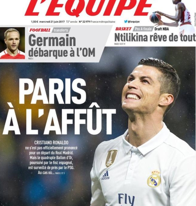 周三出版的《队报》将C罗放在了封面,表示巴黎圣日耳曼正在密切关注C罗的举动,时刻准备行动签下C罗。另一方面,巴黎也准备了一份C罗的报价预算,预计为1亿-1.5亿之间,低于皇马要求的2亿欧元。