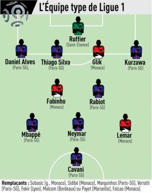 中场:法比尼奥(摩纳哥)、拉比奥(巴黎圣日耳曼)、姆巴佩(巴黎圣日耳曼)、内马尔(巴黎圣日耳曼)、勒马尔(摩纳哥)