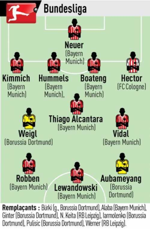 替补:比尔基(多特蒙德)、阿拉巴(拜仁)、金特尔(多特蒙德)、凯塔(莱比锡)、亚尔莫连科(多特蒙德)、普利西奇(多特蒙德)、维尔纳(莱比锡)