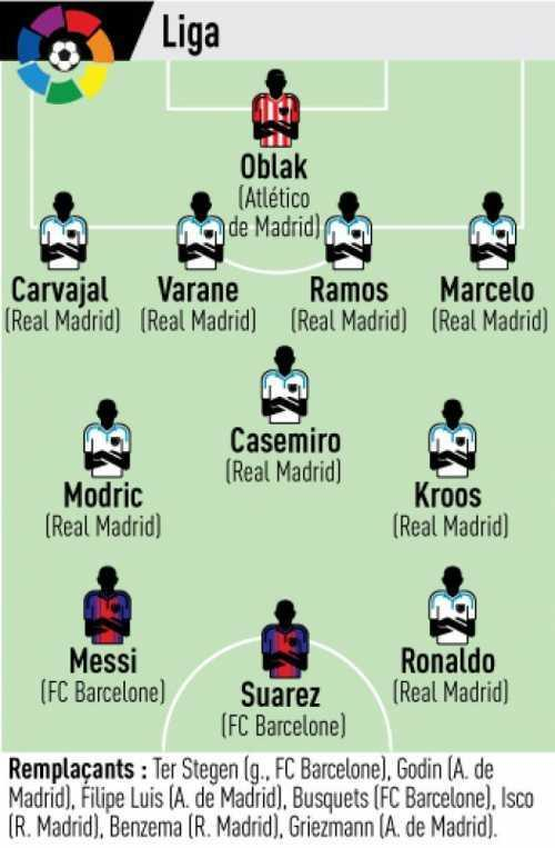 替补:特尔施特根(巴萨)、戈丁(马竞)、菲利佩-路易斯(马竞)、布斯克茨(巴萨)、伊斯科(皇马)、本泽马(皇马)、格列兹曼(马竞)