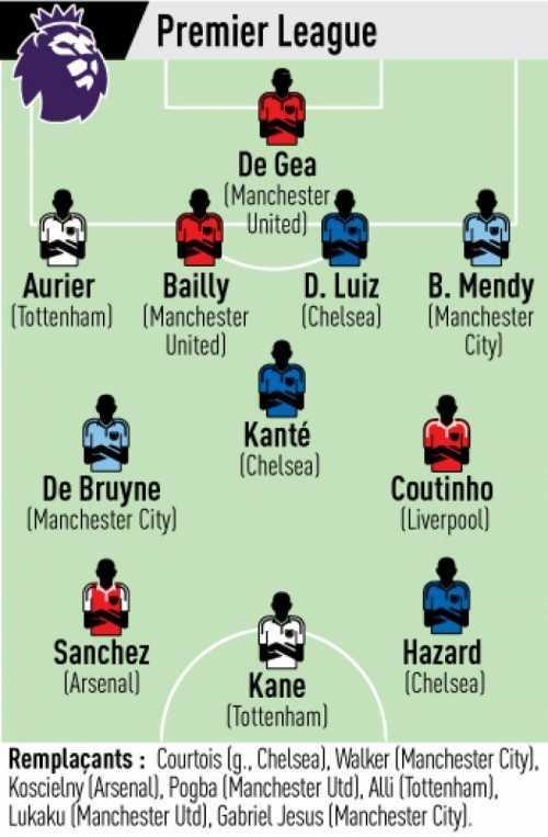 替补:库尔图瓦(切尔西)、沃克(曼城)、科斯切尔尼(阿森纳)、博格巴(曼联)、阿里(热刺)、卢卡库(曼联)、热苏斯(曼城)