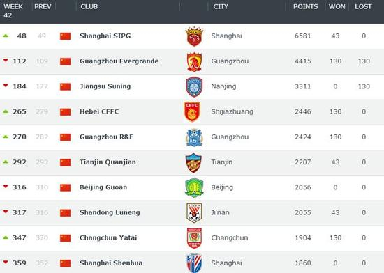 据新一期clubworldranking数据排名显示,世界前3的俱乐部分别是皇马、巴萨、马竞。上港排名亚洲第2,世界排名第48位。