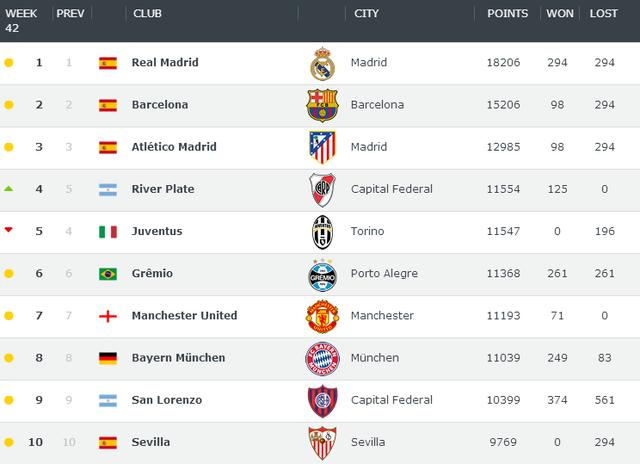 该统计网站数据前10位分别为:皇马、巴萨、马竞、河床、尤文图斯、格雷米奥(巴西)、曼联、拜仁、圣洛伦索(阿根廷)、塞维利亚。