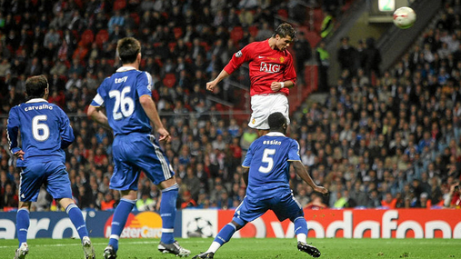 07/08赛季欧冠决定,曼联激战切尔西,第26分钟曼联首次射手就打破僵局,布朗和斯科尔斯二人转后摆脱兰帕德传中,C罗远点高高跃升头球点进大门!可怜未能盯住C罗的埃辛成了最佳背景帝,C罗弹跳之时,埃辛只能原地目送皮球入网,切赫也毫无反应。此球也是C罗首个欧冠冠军的关键进球!