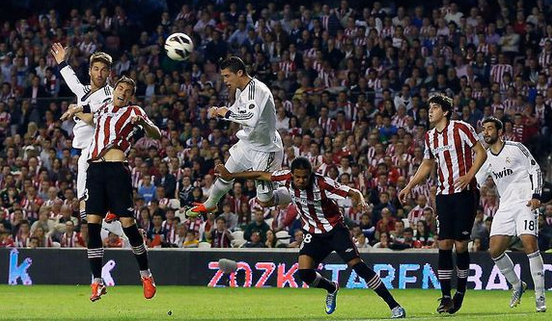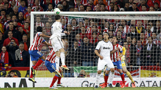 12/13赛季西班牙国王杯决赛,皇马激战马竞的比赛中,第14分钟厄齐尔开出角球,C罗门前力压法尔考和戈丁两人的夹击腾空头球冲顶,皮球直蹿左角而入,为皇马首开纪录。瞬间强压两人防守,足见C罗的霸气弹跳!