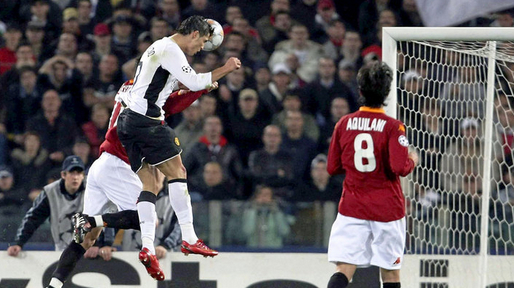 07/08赛季欧冠,曼联客场挑战罗马的比赛中,C罗攻进一粒惊世骇俗的冲顶头球!第39分钟,鲁尼突破分球,斯科尔斯禁区右侧传中,C罗中路高速插上腾空暴力冲顶而入,帮助曼联首开纪录!C罗甚至因为用力太猛撞击辛苦倒地,此球无论冲力、弹跳、腾空高度,C罗展露无解的铁球之功,C罗本人甚至一直认为此球是他职业生涯的最佳头球。