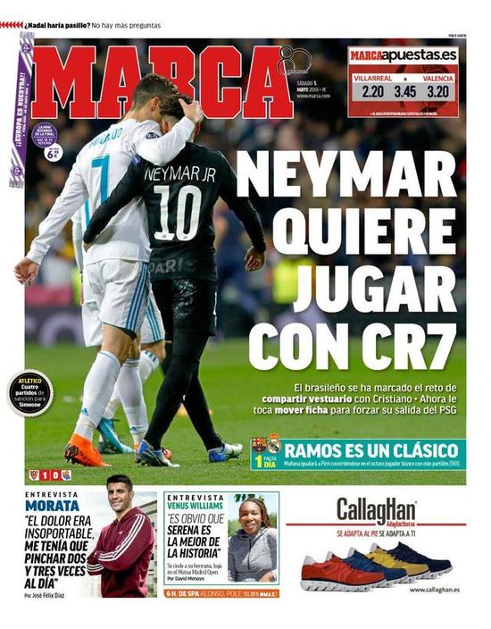 西班牙《马卡报》在周六的封面头条报道,内马尔想要和C罗一起踢球,这个巴西人立下了和C罗一起踢球的目标,决定强行离开大巴黎。