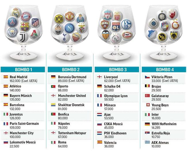 根据规则,上赛季欧冠冠军皇马和欧联杯冠军马竞进入第一档,欧足联积分前六联赛的冠军则占据了其余一档的名额。其他球队根据积分系数依次分档。由于本菲卡淘汰PAOK晋级,因此利物浦没能进入第二档。