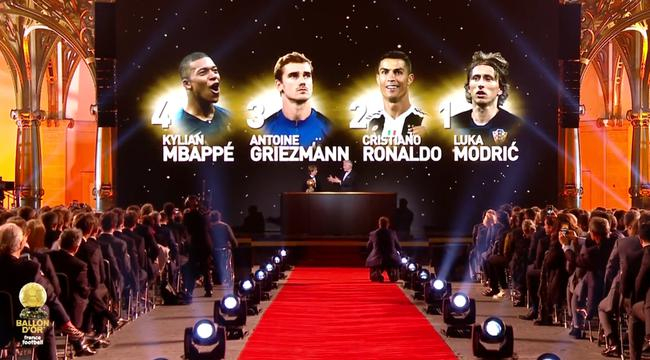 法国队将帅登台接受访谈。接着宣布金球奖得主莫德里奇。其他3位排名则是姆巴佩第4名;格列兹曼第3名;C罗第2名。“这是种难以置信的感觉,”莫德里奇说:“我仍然在试图理解,我已经成为获得过金球奖的一群杰出球员的一员。”