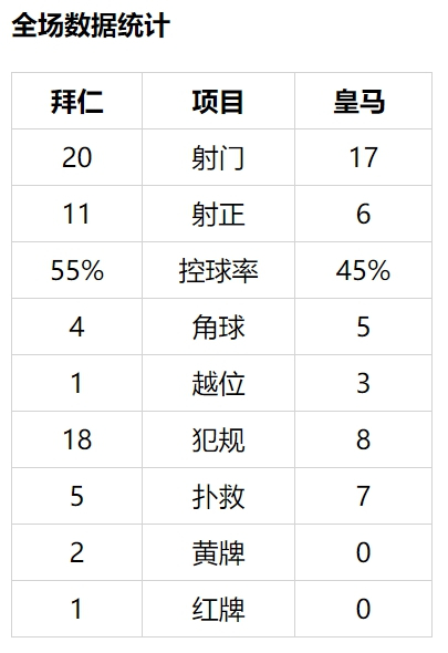 上半时拜仁射正次数占优(6比4),但4次扑救的诺伊尔最为抢镜。下半时,皇马完全换了套阵容,拜仁则换上乌尔赖希、帕瓦尔、聚勒、莱万、格纳布里。科曼左路传中,蒂亚戈在门前5米处冲顶偏出远门柱。