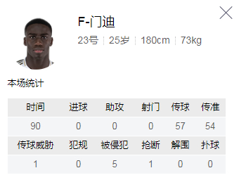 全场比赛,门迪传球57次,只3次失误,传球准确率达到95%。作为后卫的他4次过人,3次成功。此外他还赢得空中对抗1次,铲球1次。门迪在进攻时显得犀利,在防守时能给球队上一把锁。