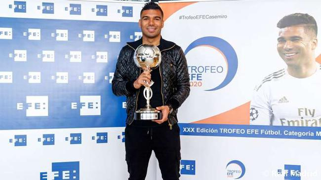 西班牙著名的通讯社埃菲社日前评选出了“2020埃菲社奖”得主,皇马中场大将卡塞米罗获得奖杯。这一奖项是奖励年度表现最好的拉丁美洲球员的。