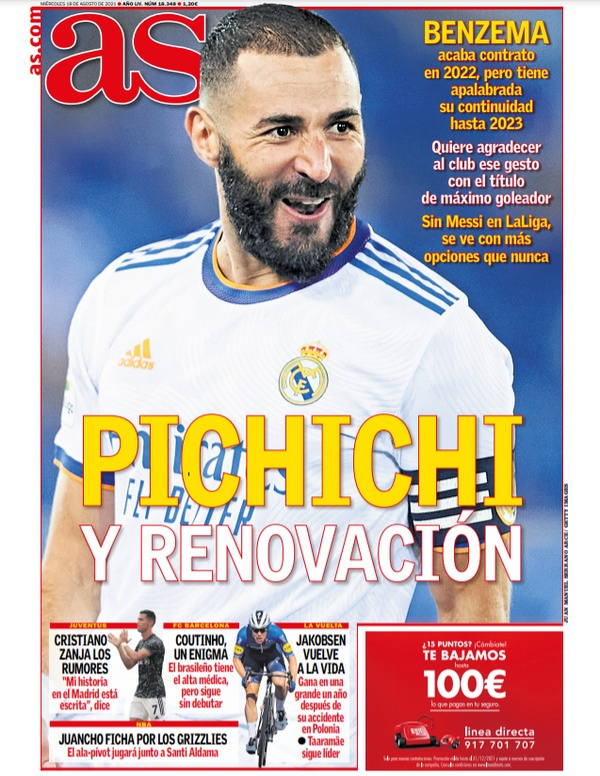 西班牙《阿斯报》在周三的头版头条披露,皇马正与本泽马敲定续约到2023年的最后细节,而本泽马也想用一个西甲最佳射手的奖杯作为回报。