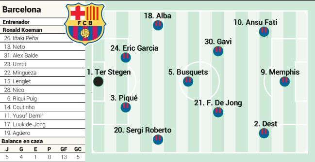 特尔施特根/罗伯托、皮克、埃里克·加西亚、阿尔巴/F·德容、布斯克茨、加维/德斯特、德佩、法蒂