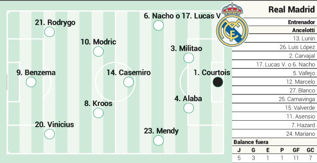 库尔图瓦/巴斯克斯(或纳乔)、米利唐、阿拉巴、门迪/莫德里奇、卡塞米罗、克罗斯/罗德里戈、本泽马、威尼修斯
