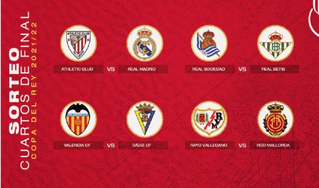 国王杯1/4决赛将采取单回合赛制,比赛日期为2月1日、2、3日。主队在前。