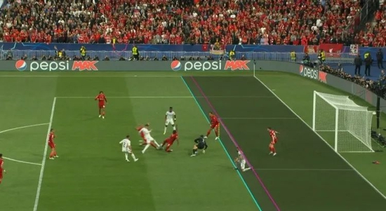 于是在上半场临近结束前,本泽马在罗伯逊身边找到了机会,但最终被判为进球无效: