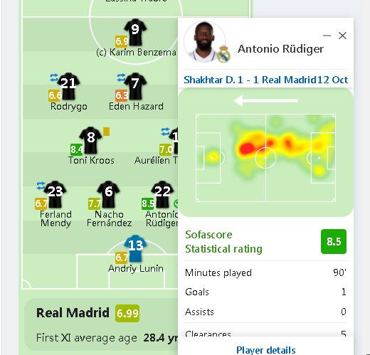 欧冠小组赛第4轮,虽然皇马在客场1比1与顿涅茨克矿工战平。比赛最后时刻进球帮助皇马扳平比分的吕迪格,赛后获得了全场最高分8.5分。