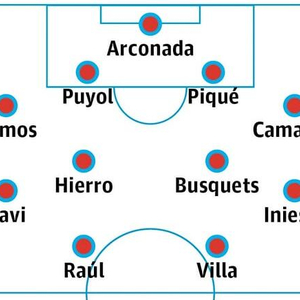 “在西班牙各级别青年队时,我就和哈维一起踢球,我们在1999年一起拿到了U20世界杯冠军,还有2010世界杯冠军。因为他非凡的传球能力,他肯定要进入这个阵容。伊涅斯塔在中场的另一边,他在南非为我们打进了那个著名的制胜球。”