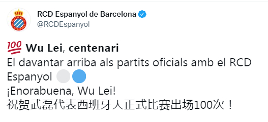 西班牙人官推用中文向武磊表示祝贺:“祝贺武磊代表西班牙人正式比赛出场100次!”