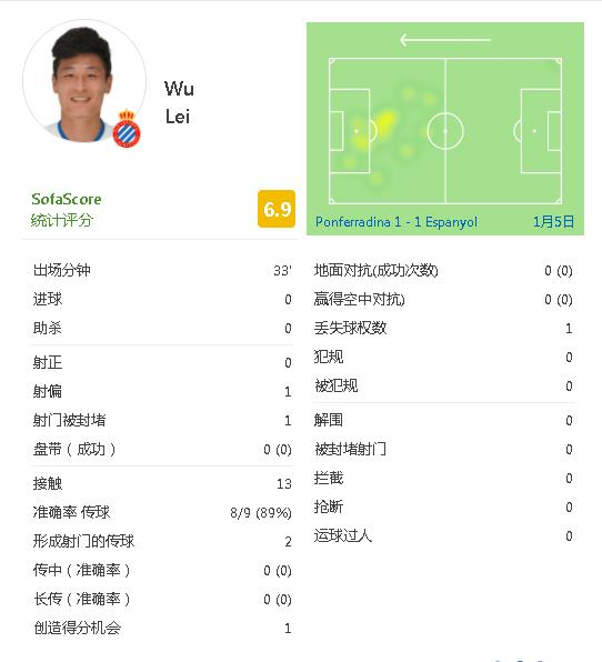 33分钟时间,武磊触球13次,传球9次,8次到位,传球准确率89%。