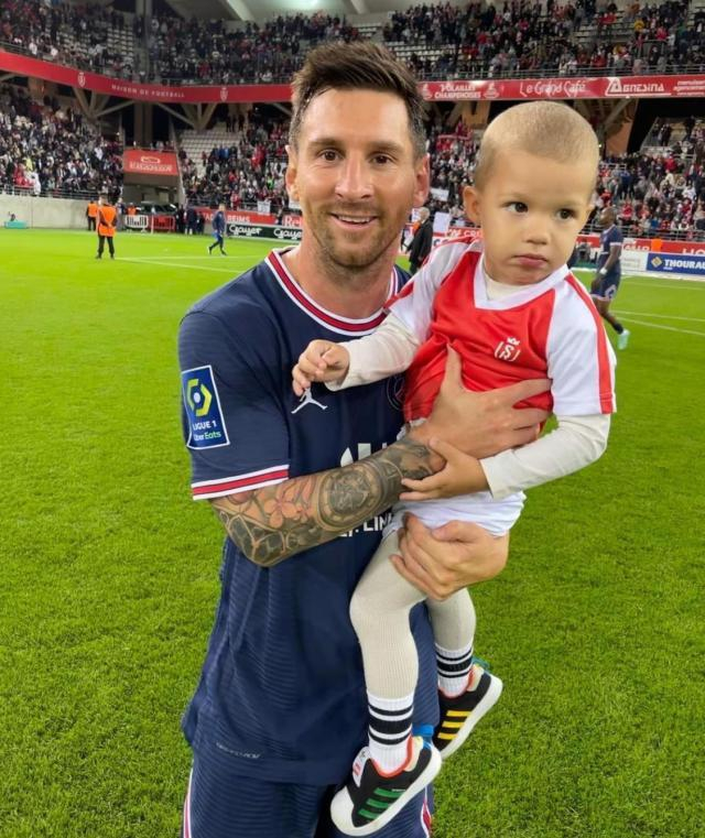 比赛结束后,兰斯门将拉伊科维奇特意把自己的儿子抱进场内,交到梅西的怀抱里,自己则拿起手机,留下了这样一张照片: