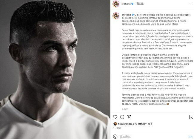 在颁奖前一天,媒体先是透露了C罗不会前往巴黎参加颁奖典礼,而在公布的前一刻,C罗在自己的社交媒体上发文,驳斥了《法国足球》主编费雷此前的说法:C罗只有一个目标,那就是退役时获金球奖次数比梅西多。