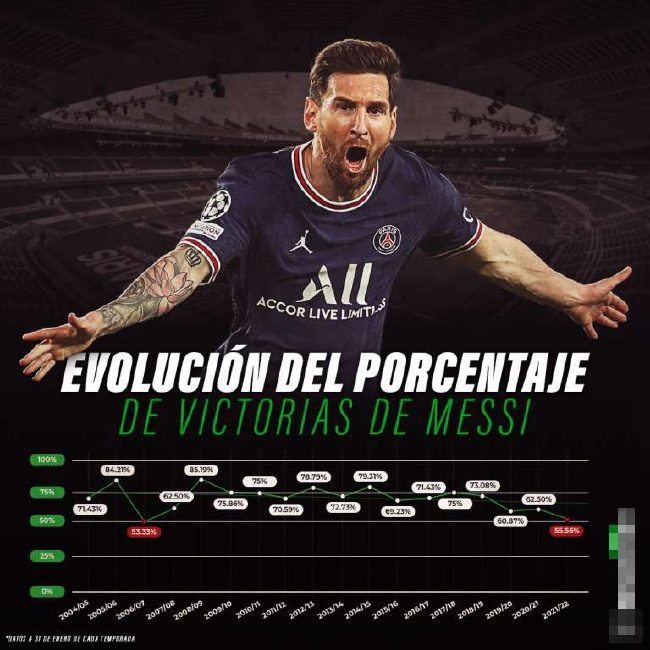 巅峰时期,梅西的胜率低于70%都罕见,但最近3个赛季,他的胜率都低于70%。2019-20赛季是60.87%,2020-21赛季是62.50%,本赛季更是跌到55.56%。职业生涯仅高于2006-07赛季的53.33%。