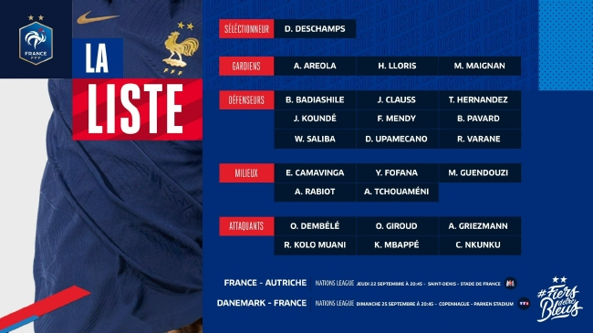 9月15日,法国国家队公布了新一期国家队的名单,姆巴佩、格列兹曼等球星在列,登贝莱回归,而本泽马、坎特、博格巴等球星因伤缺阵。