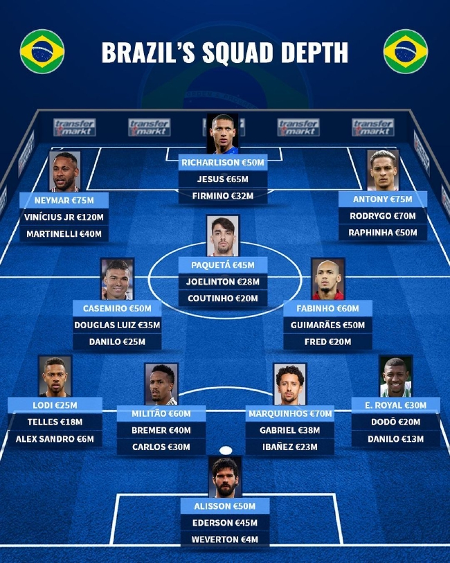 世界杯11月就要在卡塔尔开幕,德国转会市场网站也为巴西国家队排出了阵容。作为夺冠热门,巴西队可以说是人才济济,他们甚至可以排出三套阵容,板凳厚度实在令人羡慕。