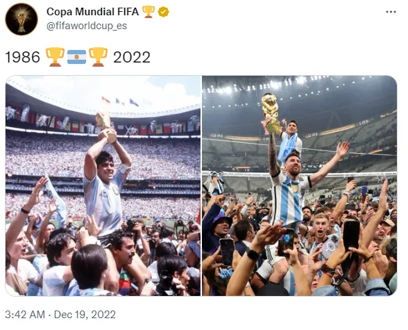 值得一提的是,赛后阿圭罗将梅西扛到了肩上,让梅西举起奖杯庆祝,这个动作复制了1986年世界杯后马拉多纳的庆祝画面。