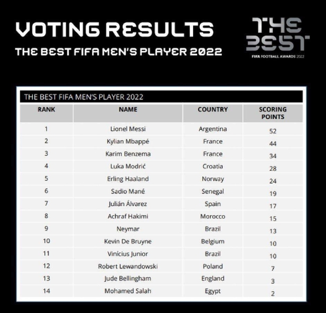 国际足联公布了得分情况。梅西的优势并不明显,他获得52分,姆巴佩44分,本泽马34分。