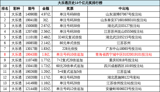 截至目前,大乐透已经开出过14次亿元巨奖,4天前山东开出的3亿巨奖排在国内大乐透排行榜中第6,而本次青海1.8亿巨奖排在第8位!