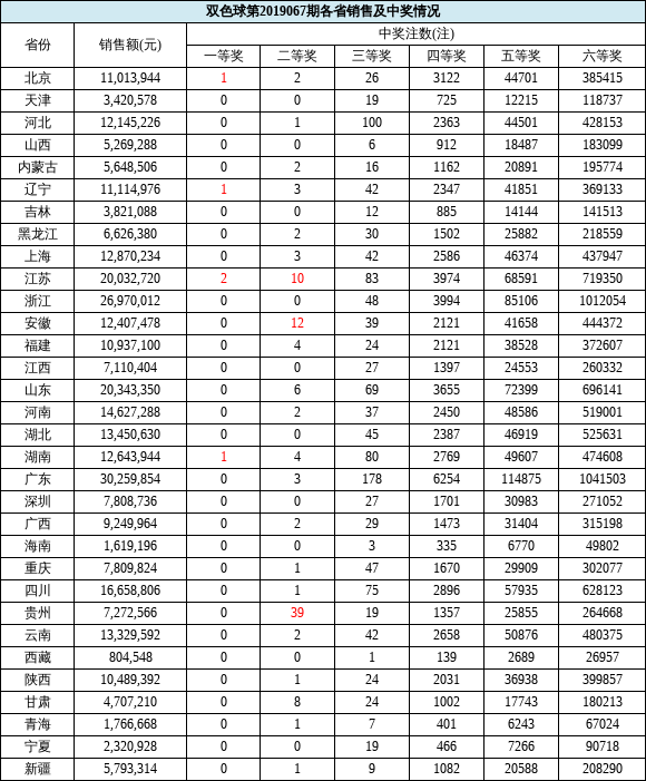 当期全国销量为3.3亿元。广东(不含深圳)当期双色球销量为3025万多元高居第一;浙江以2697万多元的销量位列第二;山东以2034多万元排名第三;江苏以2003万多元排名第四;四川以1665万多元排名第五。计奖结束后,双色球奖池余额为7.81亿元。