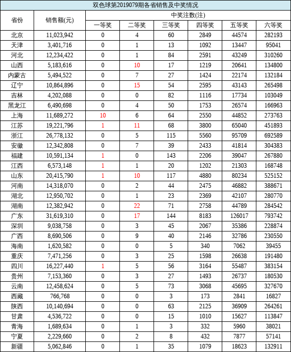 当期全国销量为3.24亿元。广东(不含深圳)当期双色球销量为3161万多元高居第一;浙江以2677万多元的销量位列第二;山东以2041多万元排名第三;江苏以1922万多元排名第四;四川以1622万多元排名第五。计奖结束后,双色球奖池余额为8.84亿元。